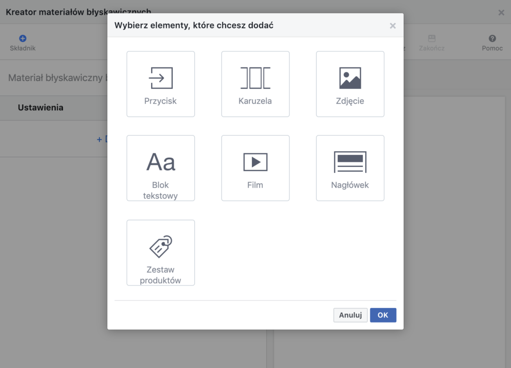 Przede wszystkim należy posiadać konto reklamowe na Facebooku i tworzyć reklamy przy pomocy Menedżera Reklam. Jeśli korzystasz z tej opcji dalej jest już prosto. Wybierasz za cel reklamy Ruch, a format Kolekcja. Jeśli nie miałeś do czynienia z Menedżerem Reklam i chciałbyś się nauczyć samodzielnie tworzyć między innymi takie reklamy, zapraszam do zapisania się na listę oczekujących na mój kurs online: Skuteczna Reklama na Facebooku.