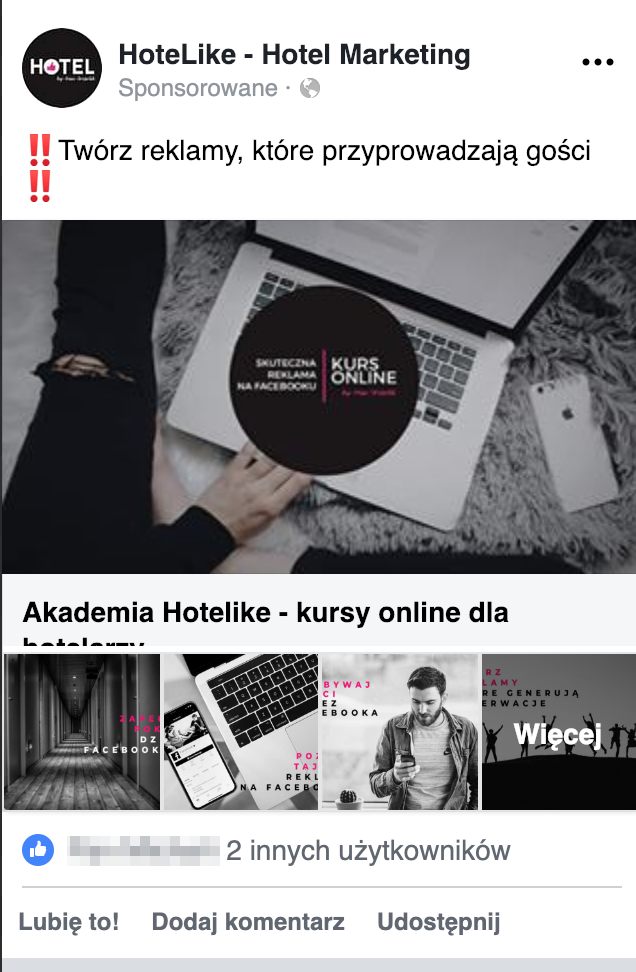Oczywiście kanwę możesz stosować do przekierowania użytkownika dalej, tak jak to ma miejsce w przypadku reklamy hotelike – klikając w SPRAWDŹ WIĘCEJ użytkownik prokierowany jest na stronę zapisu na kurs online.