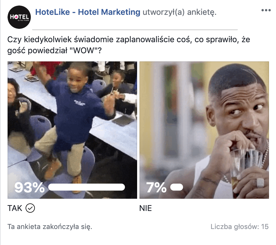 Głosów wprawdzie nie było za wiele (eh te zasięgi na FB), ale w gronie głosujących mamy przeważającą większość osób, które myślą o tym, jak zaskoczyć pozytywnie swoich gości. PODZIELCIE SIĘ SWOIMI HISTORIAMI! Potraktujcie to jak zabawę, myślcie codziennie jak wywołać efekt WOW na swoim gościu i wysyłajcie pomysły do naszego Banku Pomysłów!